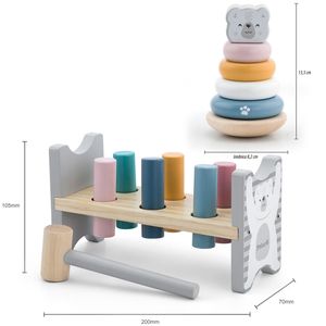 Zestaw składa się z kolorowych cylindrów, które można układać na drewnianej podstawie oraz młotka, który pozwala na uderzanie w cylindry. Dzieci mogą tworzyć różne konstrukcje, a także ćwiczyć umiejętności sortowania i dopasowywania. 🎨